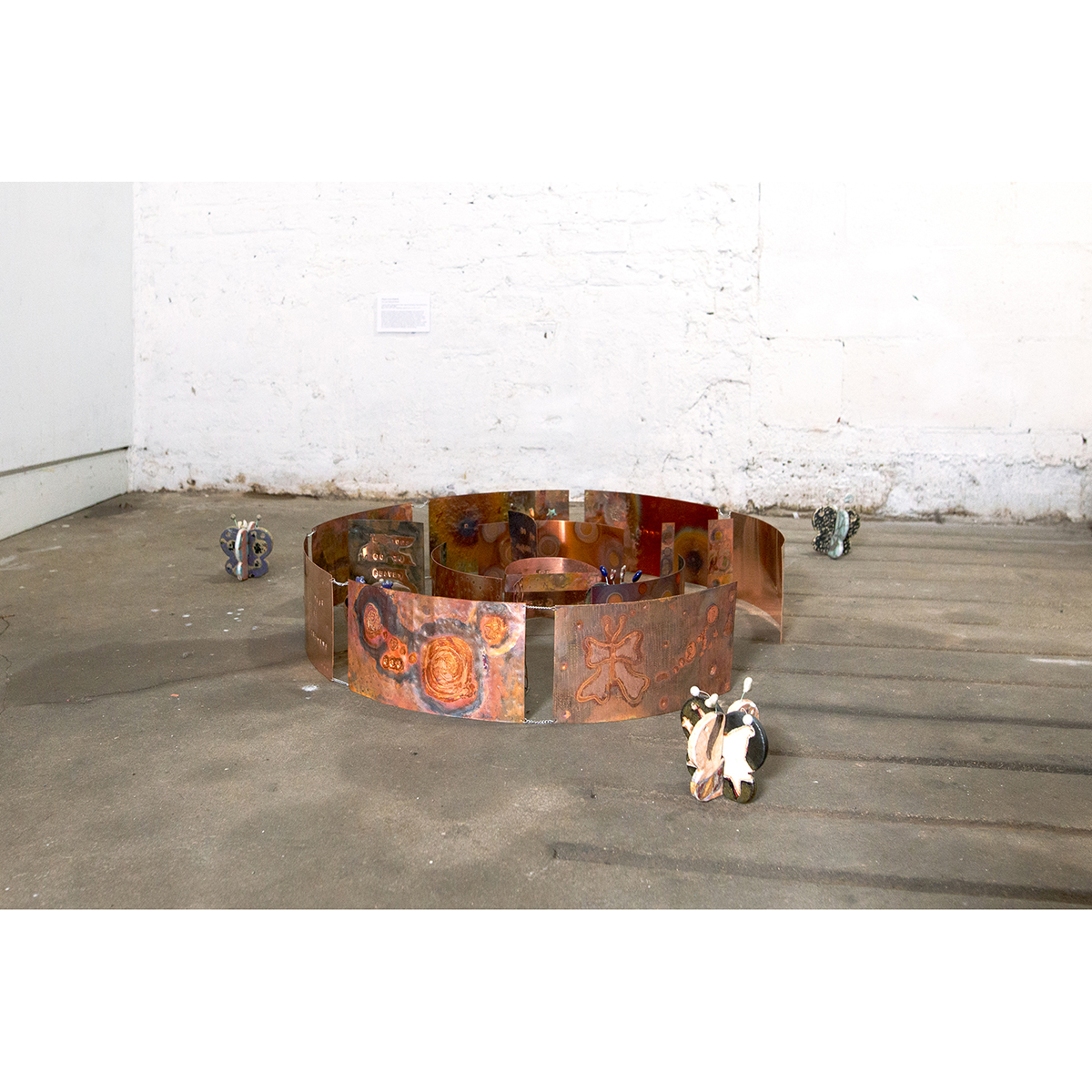 Copper metal, sterling silver metal, glazed stoneware, high temperature wire, acrylic, steel chain